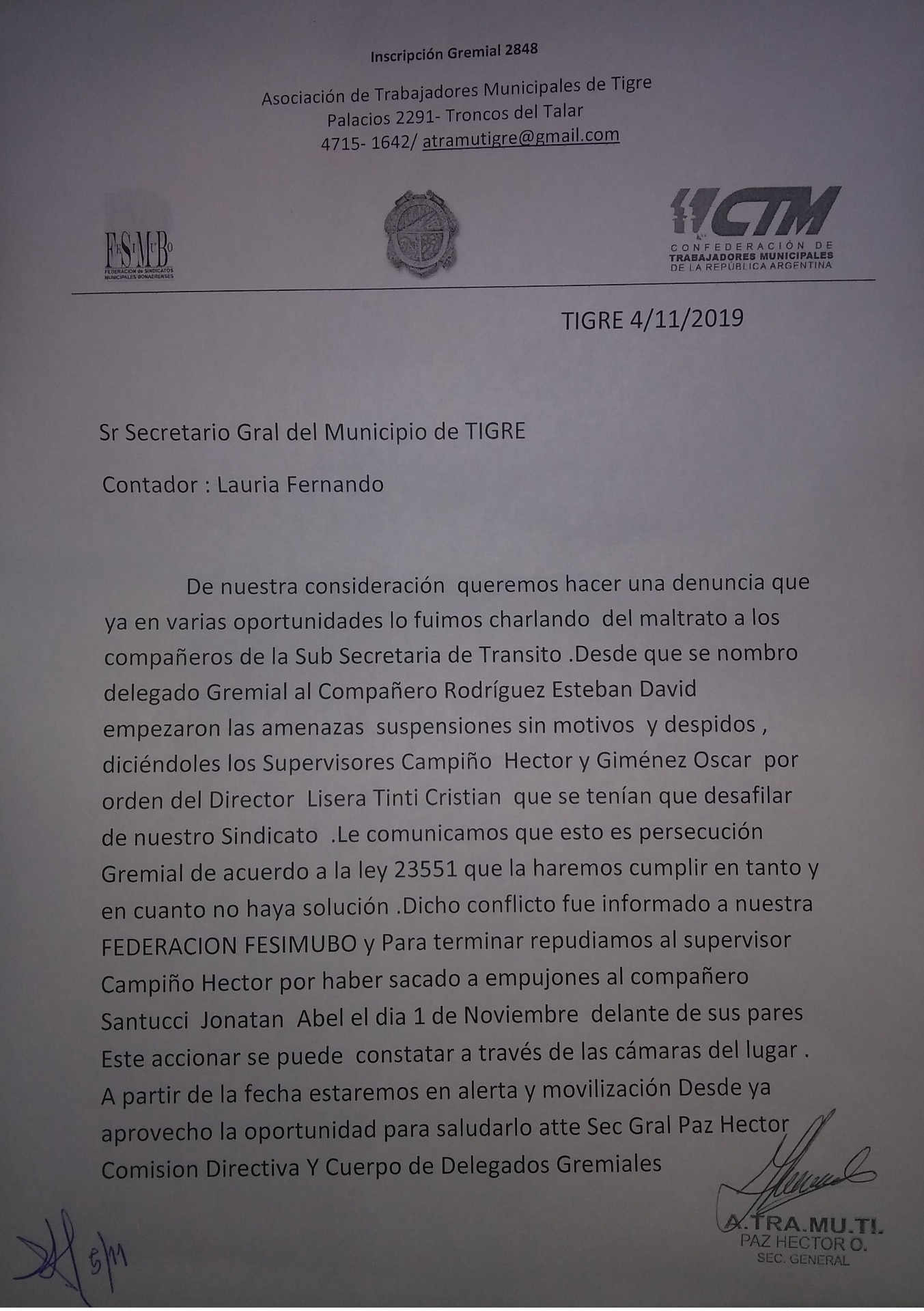 POR MEDIO DE UNA CARTA ENTREGADA PERSONALMENTE AL SECRETARIO GENERAL DEL MUNICIPIO DE TIGRE, EL SR. CONTADOR LAURIA FERNANDO DENUNCIAMOS Y REPUDIAMOS EL ACCIONAR DE LOS DIRECTIVOS ENCARGADOS DE LA DIRECCION GENERAL DE TRANSITO.-